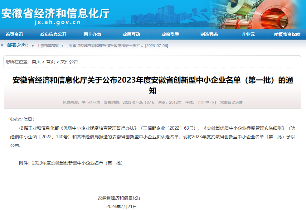 According to the Interim Measures for the Gradient Cultivation and Management of High Quality Small and Medium Enterprises (Enterprise [2022] No. 63) issued by the Ministry of Industry and Information Technology, the Implementation Rules for Gradient Management of High quality Small and Medium Enterprises in Anhui Province (Anhui Economic and Technological Small and Medium Enterprise Letter [2022] No. 140), and the list of innovative small and medium-sized enterprises in Anhui Province submitted by various municipal economic and information bureaus, Hefei In-situ Technology Co., Ltd. was recognized as an innovative small and medium-sized enterprise in Anhui Province in 2023.