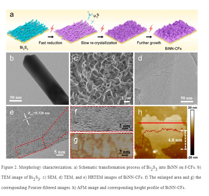 首先,在碳纖維表面涂覆一層聚四氟乙烯,經(jīng)過(guò)后續(xù)的焦耳熱方法處理實(shí)現(xiàn)了碳纖維的表面功能化(f-CFs)。隨后,將Bi2S3負(fù)載在f-CFs表面,在電化學(xué)驅(qū)動(dòng)下使其原位轉(zhuǎn)變?yōu)槿S鉍納米片網(wǎng)絡(luò)結(jié)構(gòu)(BiNN-CFs)。如圖1,2所示,原位生成的鉍納米片厚度僅為4.8 nm,在其邊緣存在豐富的晶格扭曲,同時(shí)納米片相互交聯(lián)形成三維網(wǎng)絡(luò)結(jié)構(gòu)。