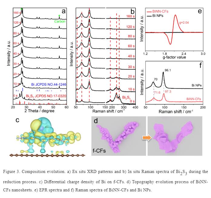 為了探究電化學(xué)轉(zhuǎn)變過(guò)程,我們利用半原位XRD,SEM,原位Raman等手段進(jìn)行了結(jié)構(gòu)和組分的追蹤。如圖3所示,在施加電位的最初幾秒,材料由硫化鉍迅速轉(zhuǎn)變?yōu)榻饘巽G。隨后,在f-CFs表面經(jīng)過(guò)相對(duì)緩慢的重構(gòu)過(guò)程,組裝為相互交聯(lián)的鉍納米片結(jié)構(gòu)。理論計(jì)算結(jié)果表明,f-CFs表面對(duì)金屬鉍具有較高的結(jié)合能,電荷離域誘導(dǎo)金屬鉍在f-CFs表面的重構(gòu)生長(zhǎng)過(guò)程。