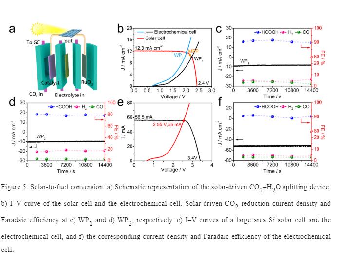 在流動(dòng)池中CO2RR性能測(cè)試表明,在-0.9V時(shí),BiNN-CFs 的甲酸法拉第效率FEHCOOH達(dá)到95.7%,在-0.5 ~-1.4 V的超寬電位區(qū)間內(nèi),FEHCOOH依然維持在92%以上。在-1.3 V時(shí),電流密度高達(dá)400 mA cm-2。特別地,通過(guò)優(yōu)化催化劑的載量,使其與太陽(yáng)能電池的最大功率點(diǎn)匹配,實(shí)現(xiàn)了優(yōu)異的太陽(yáng)能到甲酸的轉(zhuǎn)化率13.8%和高的太陽(yáng)能到電能的利用率55.6%