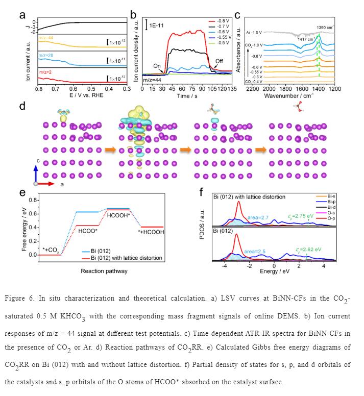 利用微分電化學(xué)質(zhì)譜揭示CO2RR過(guò)程中產(chǎn)物與電位之間的關(guān)系,同時(shí)利用原位紅外進(jìn)一步識(shí)別關(guān)鍵的反應(yīng)中間體HCOO*。理論計(jì)算結(jié)果表明,具有晶格扭曲的Bi012)對(duì)HCOO*具有更高的吸附能,能夠顯著降低反應(yīng)的吉布斯自由能,促進(jìn)CO2的吸附和活化,從而實(shí)現(xiàn)高效電還原CO2。
