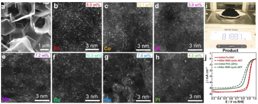 實(shí)驗(yàn)中,只需將葡萄糖溶液與多孔碳載體及金屬鹽前體混合,再與三聚氰胺一起熱處理即可獲得高密度、穩(wěn)定的單原子分散的M-Nx催化劑。該策略對(duì)多種金屬、載體、絡(luò)合劑普遍適用;制備過程簡(jiǎn)單,成本低,可規(guī)模化制備;催化劑性能優(yōu)異。例如,Fe-Nx催化劑堿性氧還原半波電位可達(dá)0.90 V,在此電位下動(dòng)力學(xué)質(zhì)量活性可達(dá)100.7 A/g,明顯優(yōu)于商業(yè)20 wt% Pt/C催化劑;Ni-Nx催化劑電催化還原CO2時(shí)在30 mA/cm2的電流密度下法拉弟效率也可達(dá)89%。這一逐級(jí)錨定新策略為宏量制備高密度、高活性、高穩(wěn)定性的單原子分散M-Nx類催化劑提供了一種新的普適的方法 Nat. Commun. 2019, 10, 1278 。