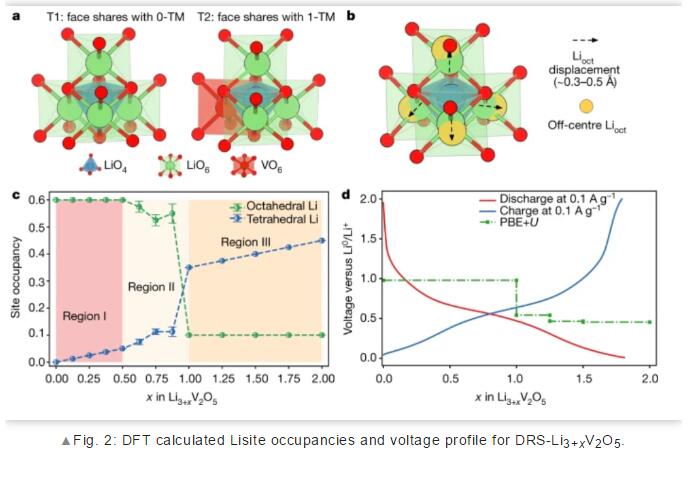 X射線(xiàn)衍射和中子衍射協(xié)同精修結(jié)果顯示Li3+xV2O5為無(wú)序巖鹽結(jié)構(gòu),晶格常數(shù)為4.095 A。氧離子完全占據(jù)四面體4a位;八面體4b位由52%的Li離子和40%的V離子共同占有;并且有4%的Li離子占據(jù)四面體8c位。根據(jù)表征結(jié)果結(jié)合DFT計(jì)算,Li3+xV2O5的結(jié)構(gòu)可寫(xiě)作[□9.6Li0.4]8c [□0.4Li2.6V2]4b[O5]4a(□為空位),該結(jié)構(gòu)中的四面體位置有充足空位可用于容納更多的鋰離子。原位X射線(xiàn)衍射實(shí)驗(yàn)和非原位中子衍射結(jié)果顯示Li3+xV2O5在繼續(xù)嵌鋰過(guò)程中僅有5.9%的晶胞體積膨脹,表明該材料的嵌鋰結(jié)構(gòu)穩(wěn)定。掃描透射電鏡的表征也驗(yàn)證了衍射實(shí)驗(yàn)的結(jié)果(Fig.1)。X射線(xiàn)吸收光譜證明該材料的電極反應(yīng)完全是來(lái)自于V離子氧化還原,并且該反應(yīng)具有良好的可逆性。 結(jié)合密度泛函理論計(jì)算,作者發(fā)現(xiàn)Li3+xV2O5在起始嵌鋰時(shí)鋰離子會(huì)優(yōu)先嵌入四面體位置。當(dāng)x=1時(shí),四面體位鋰離子之間的靜電力會(huì)導(dǎo)致部分八面體位置的鋰離子位移至其他四面體位。這時(shí)鋰離子在八面體位置的占有率驟降到10%,而在四面體位置的占有率上升至35%。在后續(xù)的嵌鋰過(guò)程中(1≤x≤2),八面體位置的鋰離子占有率維持不變,四面體位置的鋰離子占有率逐漸上升(Fig.2)。這一現(xiàn)象不同于鈦酸鋰和錳酸鋰的嵌鋰機(jī)理。