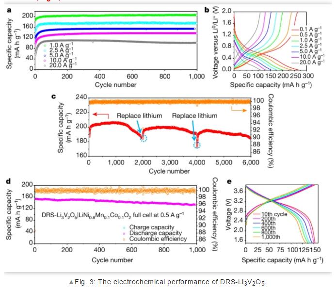 無(wú)序巖鹽結(jié)構(gòu)氧化物 Li3+xV2O5負(fù)極擁有優(yōu)異的電化學(xué)性能。在100 mA/g的電流密度下,比容量約為266 mA/g,平均反應(yīng)電壓為0.6V。在20A/g的電流密度下(20 s完成充/放電),比容量依舊可以保持在109 mA/g。在1A/g的恒定電流循環(huán)6000次后,材料容量沒(méi)有明顯衰減。在與NMC811組成的全電池測(cè)試中,平均庫(kù)倫效率大于99.98%,在1000次循環(huán)后容量保持在86.9% (Fig.3)。