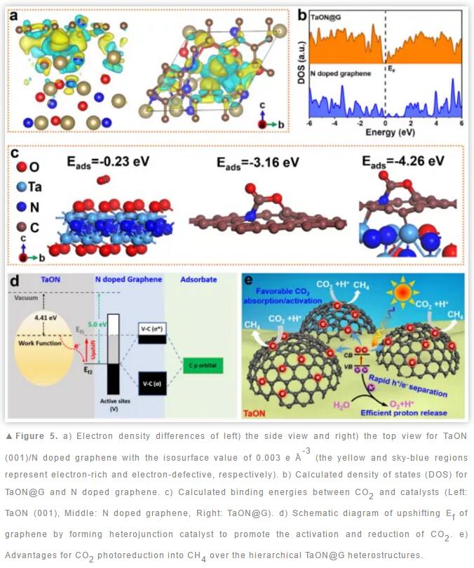 理論計(jì)算發(fā)現(xiàn),高功函石墨烯作為強(qiáng)電子受體與n型半導(dǎo)體TaON耦合能快速抽取TaON中的電子,使得石墨烯表面的局部電子密度增加,費(fèi)米能級(jí)提升。通常電子向CO2 反鍵軌道高效注入被認(rèn)為是CO2 活化的關(guān)鍵步驟,催化劑表面呈現(xiàn)電子富集態(tài)是 CO2 分子活化的重要過程。在 TaON@G 催化CO2 還原過程中,大量的光生電子被富集在島狀石墨烯表面大大增強(qiáng)了石墨烯與CO2之間的相互作用,從而弱化了 CO2中的C=O鍵,使其活化能壘降低,從而加速了 CO2 還原反應(yīng)動(dòng)力學(xué)。
