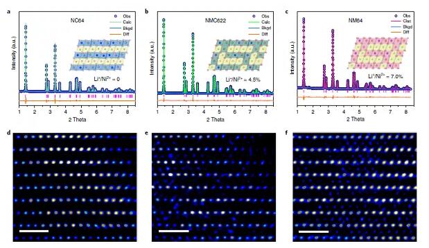 圖1 通過HEXRD精修和像差校正高分辨率TEM進(jìn)行定量原子占用率分析。(a)NC64、(b)NMC622和(c)NM64樣品的HEXRD衍射和精修;原子級觀測(d)NC64、(e)NMC622和(f)NM64樣品的TEM圖像。