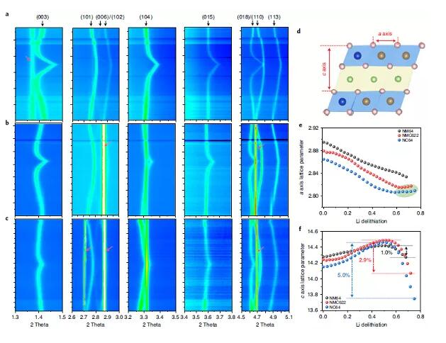 圖2 三種正極首次充放電過程中的原位HEXRD表征。原位HEXRD顯示(a)NC64、(b)NMC622和(c)NM64正極結(jié)構(gòu)演化的等高線圖;(d)層狀氧化物材料典型晶格參數(shù)示意圖;(e)從精修結(jié)果中得到的樣品中a-軸晶格參數(shù)的變化;(f)從精修結(jié)果中得到的樣品中c-軸晶格參數(shù)的變化。