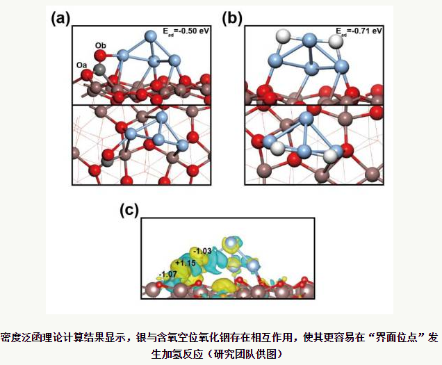 研究人員首先通過(guò)密度泛函理論計(jì)算,分析了銀與含氧空位氧化銦表面之間的相互作用。計(jì)算結(jié)果發(fā)現(xiàn),二者之間的“界面位點(diǎn)”能夠很好地活化二氧化碳分子,使其更容易在該位點(diǎn)發(fā)生加氫反應(yīng)。