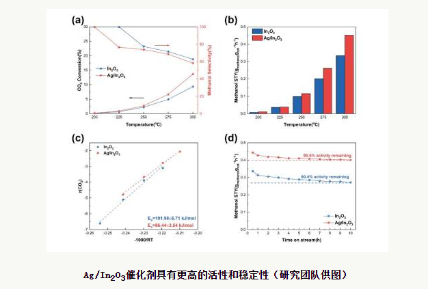 基于理論計(jì)算的結(jié)果,研究人員采用沉積沉淀法制備出Ag/In2O3催化劑,并與氧化銦催化劑對(duì)比進(jìn)行了反應(yīng)活性評(píng)價(jià)。對(duì)比結(jié)果顯示,銀的加入提升了二氧化碳加氫生成甲醇的能力,明顯降低了其轉(zhuǎn)化的表觀活化能。而穩(wěn)定測(cè)試的結(jié)果也說(shuō)明Ag/In2O3催化劑具備更好的催化穩(wěn)定性,相比In2O3催化劑,反應(yīng)10小時(shí)后,活性保持率為90.5%,而In2O3催化劑的活性保持率僅為80.4%。