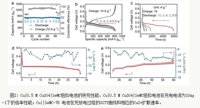 由于在充放電過(guò)程中的中間產(chǎn)物難溶于水,因此可以從根源上避免有機(jī)系Se基電池中多硒化物的穿梭效應(yīng)。Cu|0.5 M CuSO4|Se@C-48紐扣電池能夠在5分鐘內(nèi)充電800 mAh gSe?1(充電電流10 A g?1)。且當(dāng)Se@C中Se含量提高至65%時(shí),電池的快充性能無(wú)明顯變化(圖2)。Zn|0.5 M ZnSO4 ||0.5 CuSO4 |Se@C全電池可以在9分鐘內(nèi)的充電到900 mAh gSe?1,顯示出具有發(fā)展為快充電池的潛力(圖3)。第一性原理計(jì)算表明,放電中間產(chǎn)物具有優(yōu)異的電子導(dǎo)電率,此外,充放電過(guò)程中的體積效應(yīng)能夠促進(jìn)充放電速率。