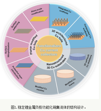 基于功能化銅集流體的設(shè)計(jì)理念和工作機(jī)制,本文系統(tǒng)性綜述了近年來功能化銅集流體在長(zhǎng)循環(huán)、無枝晶鋰金屬負(fù)極開發(fā)中的研究進(jìn)展。首先,對(duì)鋰金屬電池失效的關(guān)鍵因素和挑戰(zhàn)進(jìn)行了詳細(xì)梳理,闡明了銅集流體改性的必要性以及亟待解決的主要問題。隨后,從銅集流體的結(jié)構(gòu)化設(shè)計(jì)角度將其功能化策略分為三類(圖1),包括: