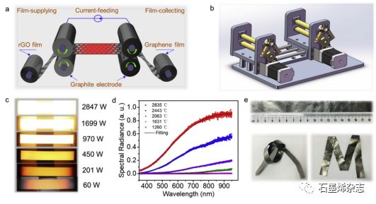 Figure 1. (a)連續(xù)電熱示意圖,(b)連續(xù)電熱裝置,(c)石墨烯膜電熱過(guò)程中的照片,(d)不同溫度的光譜圖,(e)所制備的柔性石墨烯導(dǎo)熱膜。