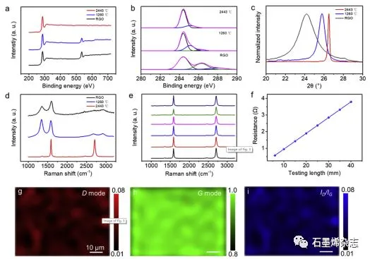 Figure 3.不同電熱溫度熱處理石墨烯膜的(a,b)XPS、(c)XRD、(d)Raman表征;(e)石墨烯膜不同位置的拉曼光譜,間隔距離為1cm;(f)石墨烯膜電阻與測(cè)試長(zhǎng)度的關(guān)系,表明制備的石墨烯膜宏觀尺寸均勻;(g-i)石墨烯膜的拉曼成像掃描,證明石墨烯膜微觀尺寸結(jié)構(gòu)均勻。