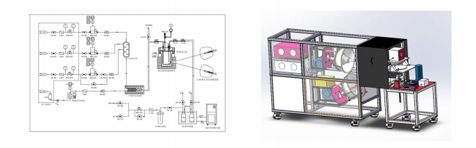 本裝置配置三路氣體進(jìn)料和一路液體進(jìn)料,使用聚光太陽能模擬裝置做為光源和熱源,高溫高壓反應(yīng)釜做為反應(yīng)器??稍u(píng)價(jià)多種原料