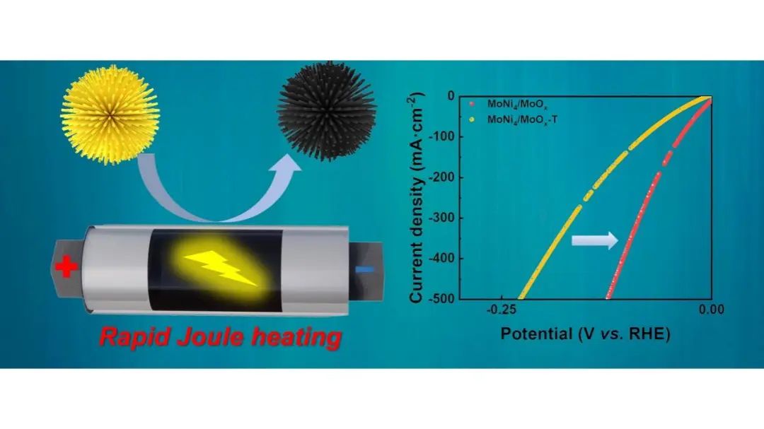 文 章 信 息 焦耳熱快速加熱制備高效Mo基電催化劑用于電催化裂解海水產(chǎn)氫 第一作者:趙展 通訊作者:孟祥超 單位:中國海洋大學 研 究 背 景 環(huán)境污染和能源短缺危機促使人們開始關(guān)注可再生氫能源(H2)的研究。電化學海水裂解制氫已成為最有前途的制氫策略之一,以地球上豐富的W、Fe、Co、Ni、Mo等過渡金屬合理構(gòu)建電催化劑成為研究前沿。然而這些催化材料通常是由傳統(tǒng)的熱解法所制備,具有低效耗時且耗能的缺點。并且面臨著長時間加熱所導致的氧化,團聚等負面影響。本文利用焦耳熱快速加熱制備出高性能析氫催化材料,通過60秒的加熱即可完成MoNi合金/氧化鉬復合材料的制備,可以有效地催化堿性海水介質(zhì)中的析氫反應(HER)。 文 章 簡 介 基于此,中國海洋大學的孟祥超教授團隊利用焦耳熱快速加熱合成的MoNi4/MoOx表現(xiàn)出了極佳的HER性能,僅需15 mV 的過電位即可達到 10 mA·cm-2 的電流密度,甚至在高電位下(1 A·cm-2)僅需227 mV,優(yōu)于傳統(tǒng)煅燒法合成的催化劑。這歸因于快速加熱所引起的催化劑形貌,Mo元素價態(tài)的變化以及快速加熱產(chǎn)生的缺陷。同時超快的加熱方法節(jié)省了大量的能源,加快了催化劑的制備速度。本文成果突出了焦耳熱快速加熱在開發(fā)用于電化學能源領域催化劑方面的獨特潛力。