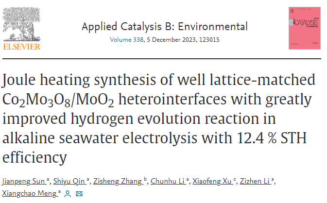 通訊作者:孟祥超; 通訊單位:中國海洋大學(xué); 原文鏈接:https://doi.org/10.1016/j.apcatb.2023.123015 全文速覽 在此,我們通過快速焦耳加熱方法,僅用130秒就成功在泡沫鎳上制備了晶格匹配良好的Co2Mo3O8/MoO2異質(zhì)界面。值得注意的是,快速焦耳加熱可以有效避免長時間加熱引起的催化劑氧化,并獲得豐富不配位Mo4+位點(diǎn),這有助于提高HER的電催化性能。制備的Co2Mo3O8/MoO2具有與Pt基電催化劑相當(dāng)?shù)腍ER活性(在10 mA cm?2下為23 mV)。同時樣品在200小時的測試中也顯示出在堿性海水電解中優(yōu)異的穩(wěn)定性。值得注意的是,太陽能驅(qū)動的H2O-H2電解槽還顯示出12.4%的太陽能-氫氣(STH)效率。國產(chǎn)陰離子交換膜(AEM)海水電解槽的池電壓在50°C下200 mA·cm?2時僅為2.13 V,生產(chǎn)1 m3 H2僅需4.7 kW-h。DFT計(jì)算表明,電子自發(fā)分布在Co2Mo3O8/MoO2異質(zhì)界面的Co–O–Mo鍵上,可以調(diào)節(jié)Mo位點(diǎn)的電子結(jié)構(gòu)和d帶中心,從而實(shí)現(xiàn)H2O在Mo位點(diǎn)的高效吸附和O位點(diǎn)接近零的氫吸附自由能。這項(xiàng)研究提供了一種通過焦耳熱調(diào)節(jié)化學(xué)態(tài)的新策略,以高效分解海水釋放H2。 背景介紹 電催化海水分解作為一種有效的氫氣生產(chǎn)方法,被認(rèn)為是解決淡水短缺危機(jī)和滿足未來全球能源需求的一種很有前途的替代方案。二氧化鉬(MoO2)作為HER電催化劑,以其良好的導(dǎo)電性、耐腐蝕性而日益受到人們的關(guān)注。然而,由于暴露不足和活性位點(diǎn)反應(yīng)動力學(xué)差,MoO2的電催化活性需要進(jìn)一步提高才能得到廣泛應(yīng)用。通常,MoO2的電催化活性由水的吸附和氫從表面Mo位點(diǎn)或O位點(diǎn)的解吸決定。界面工程作為一種有效的方法,可以直接調(diào)節(jié)界面上的Mo-O鍵,然后調(diào)整結(jié)合能,從而加速H2的產(chǎn)生。 近年來,焦耳熱效應(yīng)被應(yīng)用于快速合成新材料,材料可以在超高溫(>2000?K) 短時間內(nèi)(≈12?ms)快速合成,并避免在長時間加熱過程中活性位點(diǎn)的堆積。同時,快速冷卻也容易導(dǎo)致結(jié)構(gòu)畸變和晶格應(yīng)變,從而提供豐富的不配位催化位點(diǎn)。因此,快速焦耳加熱有望彌補(bǔ)傳統(tǒng)加熱過程中催化劑界面上活性位點(diǎn)的氧化、聚集和失活問題,并可能實(shí)現(xiàn)豐富的不配位Mo位點(diǎn)。然而,尚未對焦耳加熱效應(yīng)進(jìn)行相關(guān)研究來設(shè)計(jì)和合成MoO2基電催化劑。此外,泡沫鎳(NF)和泡沫銅(CF)的使用可以有效地避免粉末催化劑容易脫落的問題。三維(3D)形態(tài)、空穴結(jié)構(gòu)和導(dǎo)電基底可以提高比表面積,加速電子轉(zhuǎn)移,增加活性位點(diǎn),有利于H2的釋放。 研究目標(biāo) 在這里,我們通過快速焦耳加熱構(gòu)建了一種新型的在泡沫鎳上晶格匹配良好的富含非配位Mo4+位點(diǎn)的Co2Mo3O8/MoO2/NF電催化劑。在焦耳加熱過程中,Co2Mo3O8/MoO2/NF暴露出豐富的Co2Mo3O8和MoO2相容界面和晶格位錯,這可以導(dǎo)致異質(zhì)界面上的電子重排,增強(qiáng)界面上的Mo-O鍵,從而優(yōu)化活性位點(diǎn)的活性。結(jié)果表明,Co2Mo3O8/MoO2/NF在海水裂解和陰離子交換膜(AEM)海水電解槽中表現(xiàn)出優(yōu)異的HER活性和穩(wěn)定性。最后,通過實(shí)驗(yàn)和理論研究,探討了制備樣品的機(jī)理。 總結(jié)與展望 總之,通過快速焦耳加熱和氫還原方法在泡沫鎳基底上制備了晶格匹配良好的Co2Mo3O8/MoO2異質(zhì)界面。高溫快速處理促進(jìn)了晶格匹配的Co2Mo3O8/MoO2/NF的形成,增強(qiáng)了豐富的非配位Mo4+位點(diǎn),調(diào)節(jié)了O原子的電子結(jié)構(gòu)。電化學(xué)測量表明,Co2Mo3O8/MoO2/NF提供了較低的過電位。